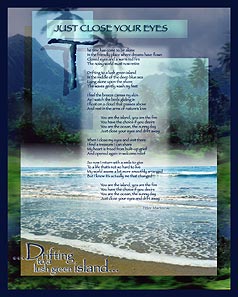 | JUST CLOSE YOUR EYES The time has come to be alone In the friendly place where dreams have flown Closed eyes and a warm red fire The noisy world must now retire Drifting to a lush green island In the middle of the deep blue sea Lying alone upon the shore The waves gently wash my feet I feel the breeze caress my skin As I watch the birds gliding in I float on a cloud that passes above And rest in the arms of natures love You are the island, you are the fire When I close my eyes and visit there You are the island, you are the fire