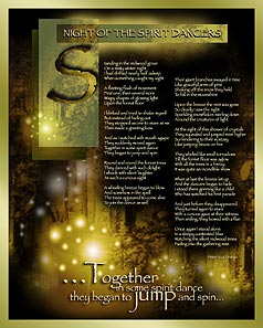| NIGHT OF THE SPIRIT DANCERS Standing in the redwood grove On a misty winter night I had drifted nearly half asleep When something caught my sight A fleeting flash of movement First one, then several more Wispy shapes of glowing light Upon the forest floor I blinked and tried to shake myself But instead of fading out They stopped as one to stare at me Then made a greeting bow And as I watched with mouth agape They suddenly moved again Together in some spirit dance They began to jump and spin Round and round the forest trees They danced with such delight I shook with silent laughter At such a curious sight A whistling breeze began to blow And somehow in the spell The trees appeared to come alive To join the dance as well Their giant branches swayed in time Like graceful arms of pine Shaking off the snow they held To fall in the moonshine Upon the breeze the mist was gone So clearly I saw the sight Sparkling snowflakes swirling down Around the creatures of light At the sight of this shower of crystals They squealed and jumped even higher Surrendering to their ecstasy Like jumping beans on fire They whirled like small tornadoes Till the forest floor was aglow With all the trees in a frenzy It was quite an incredible show When at last the breeze let up And the dancers began to fade I stood there grinning like a child Who has watched his first parade And just before they disappeared They turned again to stare With a curious gaze at their witness Then smiling, they bowed with a flair Once again I stood alone In a sleepy contented bliss Watching the silent redwood trees Fading into the gathering mist LARGE TEXT AT BOTTOM OF PAGE: ...Together in some spirit dance they began to jump and spin... Peter Martineau |