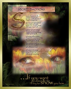 | SECRET EMOTIONS So much of my secret self Is hidden from you now But if you want to discover me Ill try to show you how Take me in your warm embrace Then slowly reach inside Find the door so tightly closed And imagine it open wide Look for my secret emotions With all your vision and skill Tenderly expose these feelings Hidden against my will At first they will be sensitive Theyve been covered up so long But they cannot hide forever The need is just too strong When at last you reach my core When the fears are calmed and kissed Even my secret emotions Will find it hard to resist And as the truth emerges From a hiding place so deep Youll find my love for you Is the secret I cannot keep LARGE TEXT AT BOTTOM OF PAGE: ...If you want to discover me I'll try to show you how... Peter Martineau |