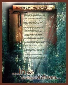 | SUNRISE IN THE FOREST The gentle spirit of a new sunrise Brings yellow and pink, then soft blue skies Shapes of redwoods and delicate ferns Emerge from the darkness as daylight returns Shadows in the forest dance with delight Sparkling dew drops reflect the light Piercing rays add a magic glow Birds sing praise at the wondrous show In the simple grace of her effortless way Our Mother Earth unfolds the day A rising mist wanders and drifts Like a pillowy blanket that gently lifts The rich brown earth slowly appears With patches of moss, moist with tears From the joy of sharing this sacred space With rainbow flowers that color her face In the stillness and beauty she whispers a dream Come walk in my forest, swim in my stream Show me, my children, your beautiful smiles Heal with me as you wander for miles Follow a path that calls you this day Let my tiniest creatures show you the way Take this moment to shed every care Enjoy a breath of cool fresh air Carry this peace in the silence within And remember that you may return here again Whenever your heart needs to feel like new The sun will be rising in the forest for you LARGE TEXT AT BOTTOM OF PAGE: ...In the stillness and beauty she whispers a dream... Peter Martineau |