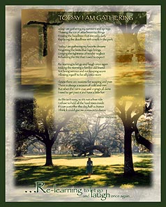 | TODAY I AM GATHERING Today I am gathering my summers and springs Thawing the ice of attachment to things Erasing the headlines that see only dark Replacing the deadlines with a walk in the park Today I am gathering my favorite dreams Forgetting the limits that logic brings Untying the tightness of tender neglect Rebuilding the Me that I used to expect Re-learning to let go and laugh once again Making the morning a familiar old friend Not being serious and not keeping score Allowing myself to be silly once more I know there are reasons for weeping and pain There is always a season of cold and rain But when the rains over and cryings all done I need to get past it and have a little fun So life isnt easy, so its not a free ride I refuse to hold all the hard times inside If I can just offer this day half a chance I think it could give me a reason to dance LARGE TEXT AT BOTTOM OF PAGE: ...Re-learning to let go and laugh once again... Peter Martineau |